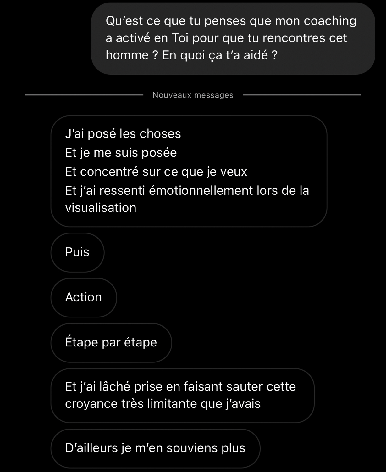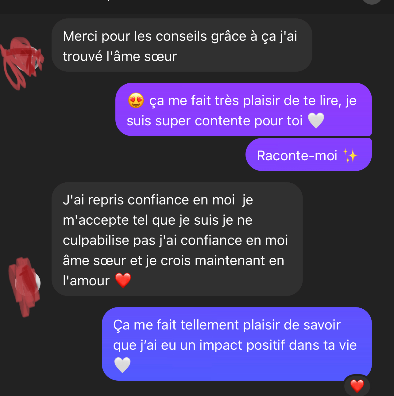 A ce jour, j'ai déjà aidé plus de 200 femmes à Reprendre Confiance en elles et Créer Leur Vie Amoureuse Idéale, ce qui m'a permis d'affiner ma méthode.