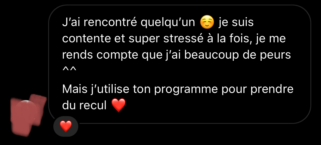 Ruminer sur tes anciennes relations, ça te maintient dans le mode "Ă©chec amoureux" qui t'empĂȘche de Trouver l'Amour. Donc ce programme va t'aider Ă te dĂ©tacher de tes exs.